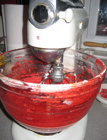 In a separate small bowl, mix together the cocoa and food coloring. Add to the shortening mixture. Don’t turn the mixer on to do this or you will end up with red food coloring on your ceiling (not that this has ever happened to me). Mix it in by hand until it’s more or less combined and then turn on the mixer to fully incorporate it.