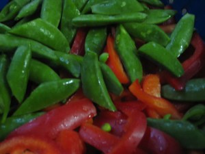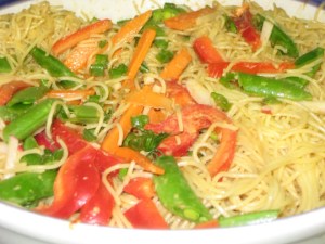** I use a wide variety of vegetables – carrots, red peppers, scallions, snow peas, radishes. Pretty much anything that’s not too watery will work, e.g. I wouldn’t use cucumbers but thinly sliced zucchini might be good.