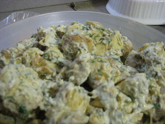 Toss the potatoes with the herbs and dressing, adding more mayonnaise as needed.