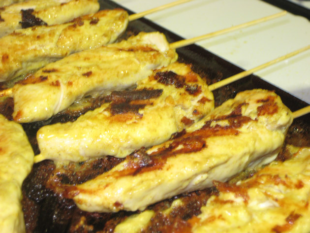 Thread each strip of chicken onto a wooden skewer (soak them in water for about 30 minutes beforehand) and cook on a lightly oiled grill until done.