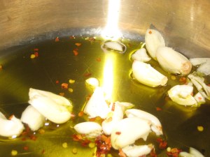 Add enough olive oil to your pan to coat the bottom slightly. Add 2-3 garlic cloves, peeled and smacked with a knife (you want them to be broken, but not chopped up) and a sprinkle of red pepper flakes (adjust according to taste). Cook the garlic in the olive oil over a very low heat for 10-15 minutes, turning occasionally. The garlic should only barely take on color. You aren’t looking to fry the garlic so much as very gently heat it to soften it and infuse the olive oil.