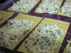 Spread the bottom of the baking dish evenly with 1 ½ cups sauce. Using a spoon or your fingers, spread a generous ¼ cup of the cheese-spinach mixture evenly onto the bottom three-quarters of each noodle (with short side facing you), leaving top quarter of noodle exposed.