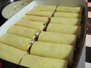 Notes:  I increased the recipe by ¼ because I was feeling oddly paranoid about having enough.  To do this I added a 12 oz jar of roasted red peppers to the sauce, and increased the quantities of the filling by ¼.  This goes against the general rule of never trying to mess with an America’s Test Kitchen recipe, but it worked out this time.