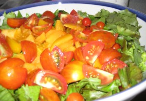 I was feeling amazing amounts of guilt over the canned tomatoes when we’re in the middle of August and all the farmer’s market tomatoes are so enticing.  So, I put them in the salad instead.  I even bought lettuce at the farmer’s market and you’d have to understand how much I hate washing lettuce to get how big a deal this is for me.  The things I do to appease my conscience.  I was, predictably, the only person at the table last night who thought that this had been a necessary gesture of appeasement.