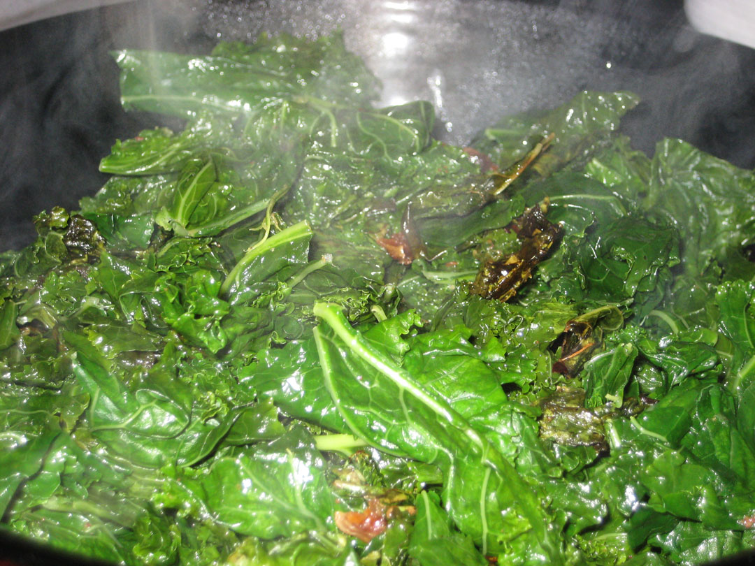 The only difference with making kale or collard greens, is that you have to strip them off the stem before you cook them. Swiss chard, spinach and bok choi are all tender enough that all you have to do is chop them roughly (or in the case of spinach, just wash it thoroughly). Kale and collard greens come on a tougher stem that won’t soften enough in cooking to be palatable. To stem them, just hold the stem at the end and strip your fingers down the stalk and the leaves will pull off easily.