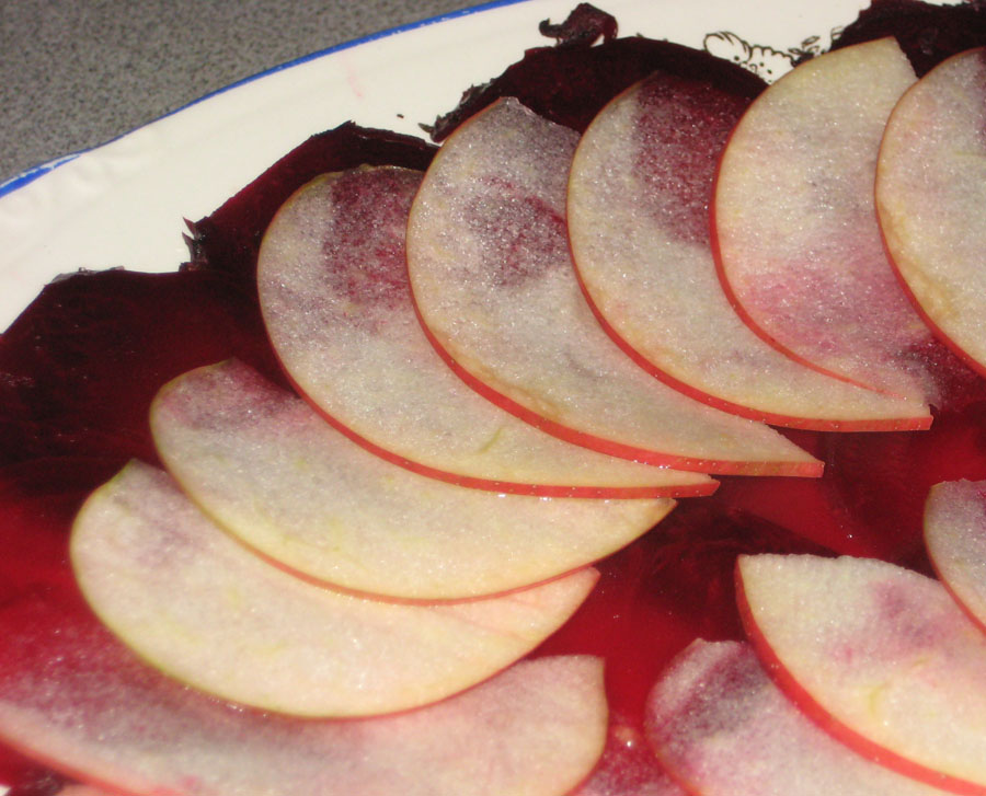 The original recipe also calls for grapefruit as well as the apple.  I think this is (a) just too many ingredients, and (b) you can’t section the grapefruit as thinly as you do the apple and the beets and it looks odd (or at least I think it looks odd), and (c) I’m the only person in my house who likes grapefruit.
