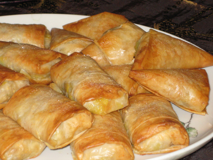 Alternatively, place sheet so short side is facing you – proceed as above folding sheet into thirds. Place about a tablespoon of filling on the bottom of the sheet and fold up in triangles.
