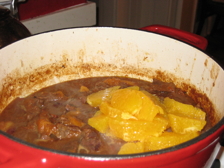 The original recipe also called for 4-6 tsp of cinnamon and 8 cardamom pods. Again, that’s a lot of cinnamon, and I cut it back to 3 tsp, and seeded the cardamom pods so that I wouldn’t have to go fishing for them before I tried to serve the stew. I think next time I’d also stud a piece of the orange rind with a few whole cloves and maybe throw in a cinnamon stick.