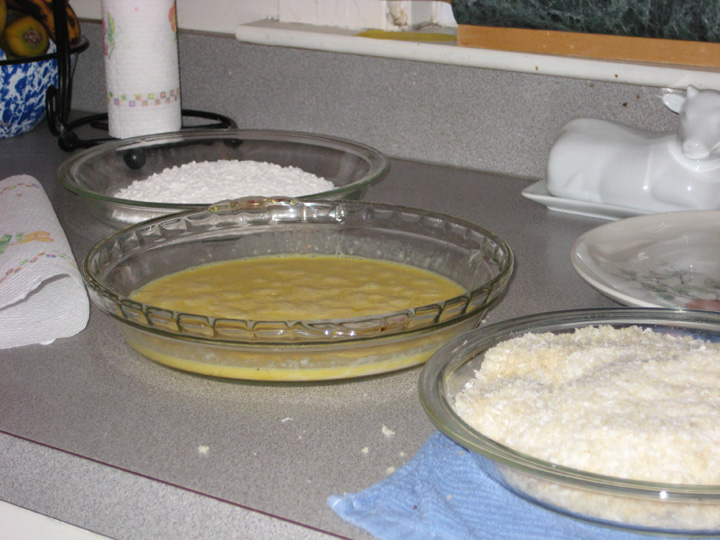 Lightly beat the eggs with the coconut milk in another shallow bowl.