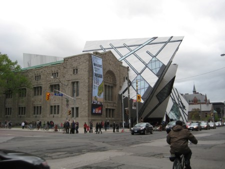 I also went to the Royal Ontario Museum – which was nice, but suffered in comparison to the Bata because it just wasn’t as well designed. I spent a pleasant hour futzing around the First Nations hall, but kept wanting them to place the different tribes geographically, and to have more of a sense of flow through the room. Possibly the most interesting thing about the ROM is the renovation/addition they did to the exterior – which is this giant modern glass angular structure that more or less sits in front of the old 19th C museum. Surprisingly, I actually kind of like it, although I’m not sure I would if I lived there. I would, I’m sure, be appalled if they did that to the MFA in Boston.