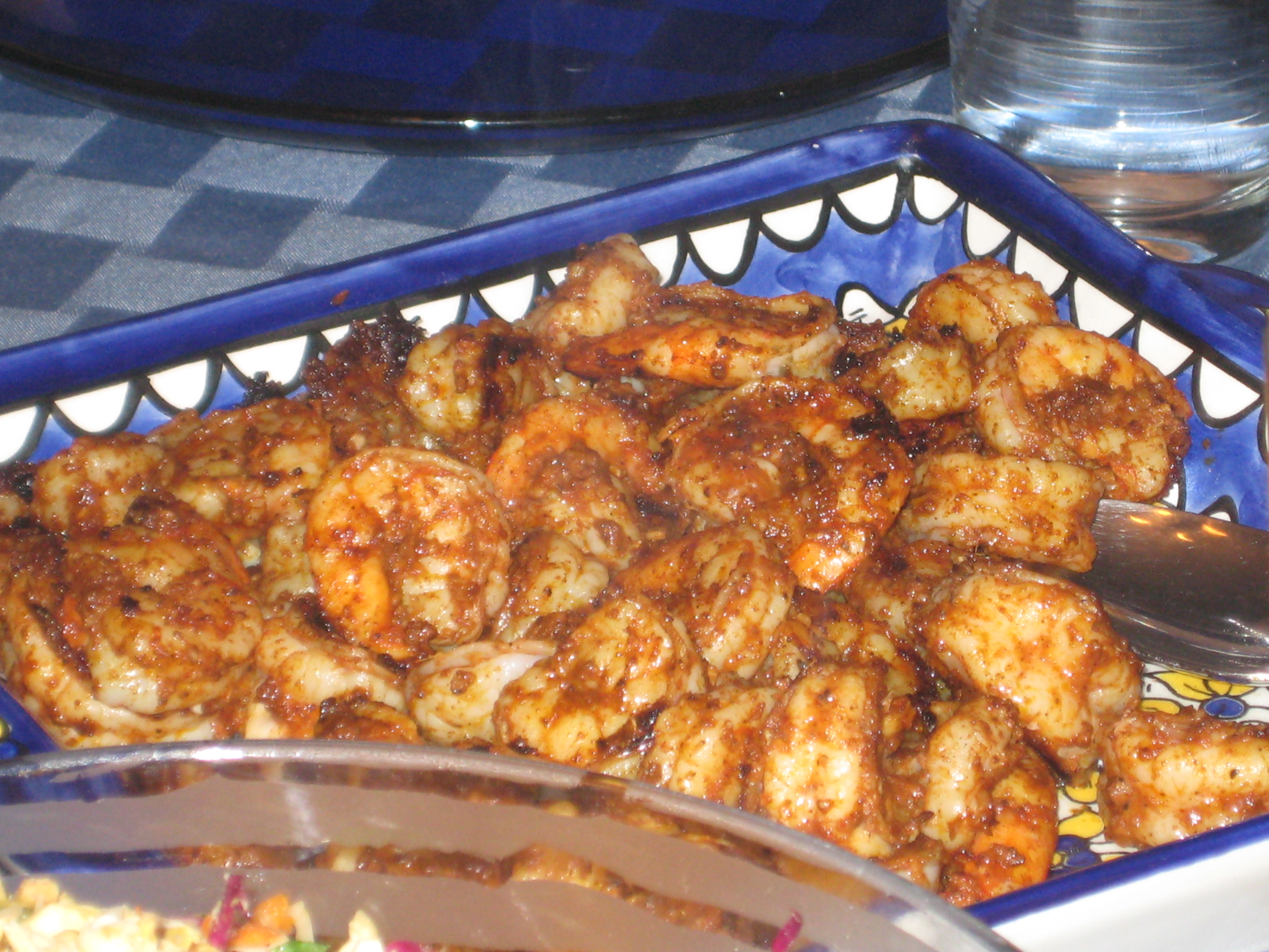 The original recipe calls for shrimp, but some people don’t like shrimp, and some people are allergic to shrimp, so I also did it with chicken. Unless you live on a coast and have access to an excellent sea food store I recommend buying (raw) frozen shrimp. Most of the shrimp you buy at a sea food counter in a grocery store has been defrosted from frozen anyway, and you can do that yourself at home in about 20 minutes and it’ll be fresher – just defrost in cold running water, shell and pat dry before you mix it with the spice rub. Plus, if you buy it frozen, the odds are good someone else will have deveined them already which is the part of shelling shrimp that I find really tedious. For the chicken, butterfly it and pound it lightly until it’s thin enough to cook up fast over a hot grill.