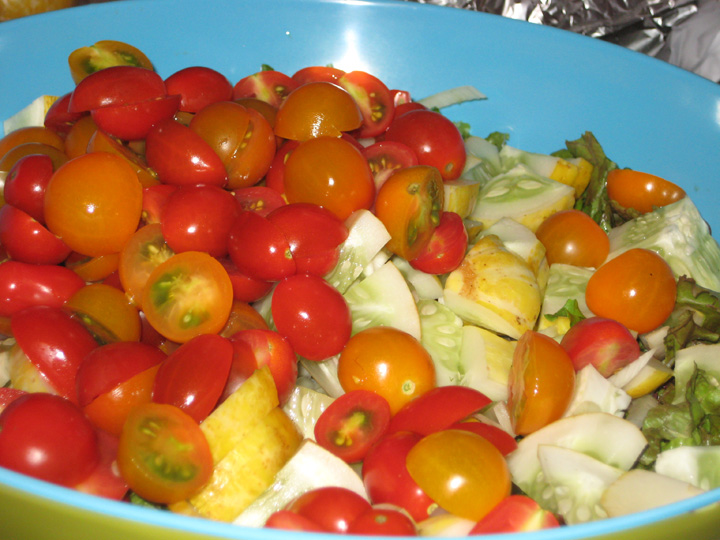 With a rainbow of grape tomatoes, lemon cucumbers, and a little fennel for crunch (and because it was sitting there in a tempting pile at the farm stand).