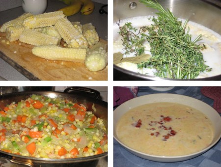 Frankly everything I did to the produce this week was overkill in the very best way. At the height of their season corn and tomatoes don’t need anything done to them to be spectacular, as evidenced by the quantity of freshly shucked corn kernels I snacked on while I was making the soup, and the number of grape tomatoes that never made it to the salad bowl. But if you felt like indulging in excess, adding bacon, goat cheese, honey and over a stick of butter to the proceedings is definitely the way to go.