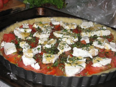 Spread an thin layer of mustard over the bottom of the tart dough and let it sit a few minutes to dry out (he doesn’t say how much – I used 2 Tbsp, use more if you like more bite).