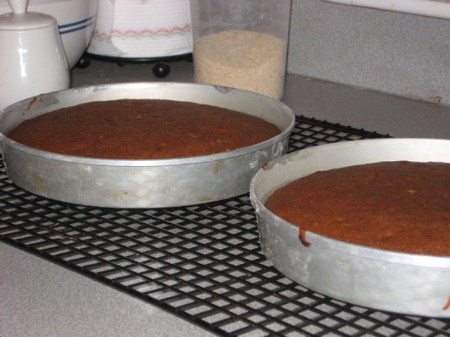 Cut around pan sides to loosen cake layers; turn out onto racks. (Hah! They make this sound so effortless. I had one layer that came out with much coaxing, and one layer that mostly fell apart on attempting to remove it from the pan – but this is why layer cakes are nice, you can cover all the flaws with mounds of frosting).