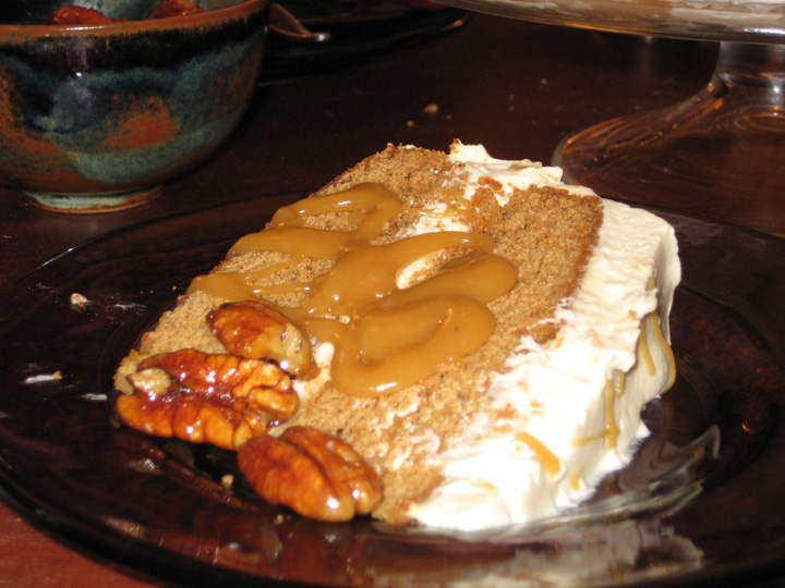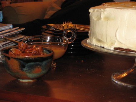 Cut pecans into pieces or leave whole. Press pecans into frosting on sides of cake (I served mine on the side for those who are allergic, or just plain don’t like nuts). Cut cake into wedges. Spoon sauce over.