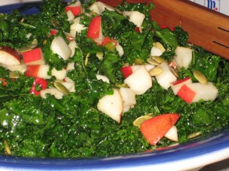 * I feel vaguely compelled to channel Spock here. A ‘bunch’ has variable definitions. A ‘bunch’ is unacceptable. Then again, I don’t actually have a better unit of measure, so a bunch it is. It will wilt down a little as you massage the olive oil into it, so slice more than you think you need, but remember that it’s not going to wilt down as much as it would if you were cooking it.