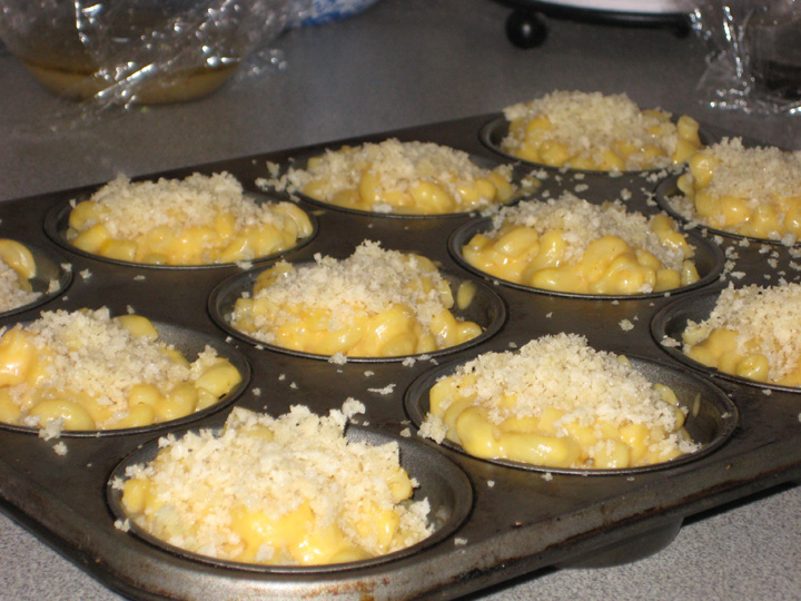 I ran across a blog where the writer had baked mac & cheese in muffin cups to maximize crispy edges and cute factor, and thought it was a genius idea. I think, after having attempted to make them, and more or less failed completely at unmolding them, that this works better in theory than in practice (although her blog had pictures, so clearly it is possible). Also, I think (heresy!) that this creates too much crispy edge in relation to gooey interior. I suspect that they are awfully cute though, if you can unmold them successfully.
