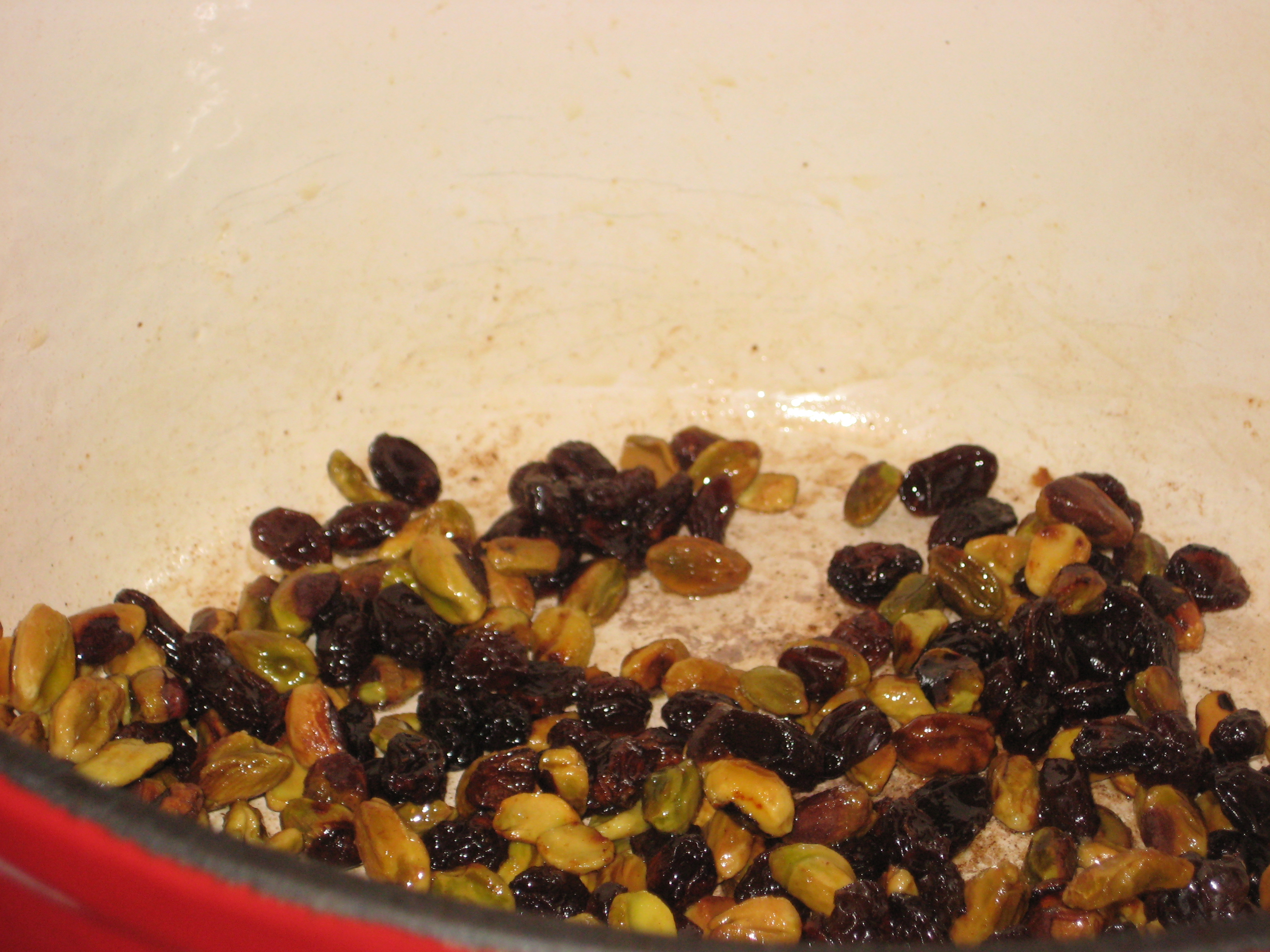 While the sauce is simmering warm 1 tablespoon of oil in a large skillet. When shimmering, add the pistachios and raisins. Cook until the raisins swell up and the pistachios toast slightly. Remove from the pan and set aside.