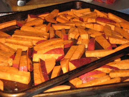 I love sweet potatoes.  There’s pretty much nothing you can do to a sweet potato that I’m going to think is a bad thing.  That being said, sweet potato fries are frequently disappointing.  All too often they’re soggy and kind of limp, and nobody wants a limp fry.  Now granted, these sweet potato fries do not remotely approach the august heights of the sweet potato fries from the Boston Burger Company which come to the table hot, crisp and tossed with cinnamon and caramel sauce.  However, for something made at home that doesn’t involve deep frying or caramel sauce they’re pretty tasty.