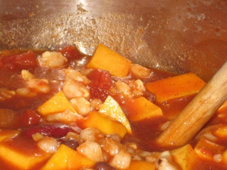 Jes has a tasty solution for leftover mashed sweet potatoes.  I’m mildly boggled by the idea that you’d have leftover sweet potatoes – in my experience they’re like leftover mashed potatoes (mythical and only ever encountered in stories) but the soup sounds good even if you had to roast potatoes deliberately to achieve it.  I’m offering up a solution for what to do with leftover turkey before you throw the bones into a soup pot and boil them up for stock.  You can, obviously, make Turkey Tetrazzini with them and I highly encourage you to do so.  But, if you had Thanksgiving Dinner on Thursday and then proceeded to eat your way through the rest of the weekend and were looking for something a little lighter, Butternut Squash Chili is also a good way to go.