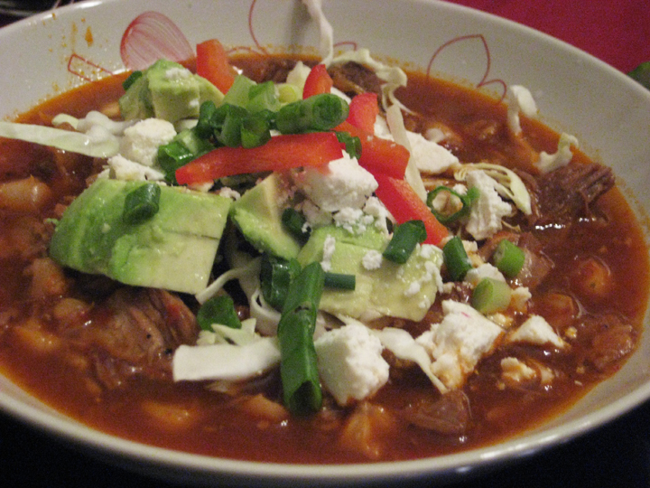 Sauté the onion in a little oil until softened and beginning to brown. Add the oregano and stir to coat. Add the reserved pork, chile paste, (defatted) braising liquid, and hominy. Add water and stock to taste (I used about 2 cups stock, and 1 cup water – you could thin this down more if you wanted to stretch the meal or a less robust soup, but be careful how much stock/water you use because you don’t want to drown out all the flavor you built with the braising liquid). Bring to a boil and then simmer for 30 minutes to blend flavors. Add more broth if necessary. Season to taste with salt and pepper.