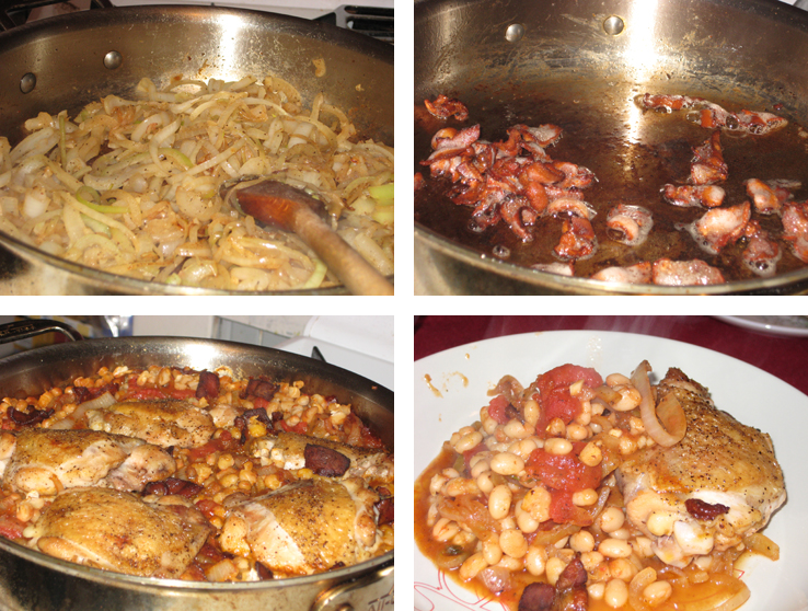 Drain off most of accumulated fat and reduce heat to moderate. Cook onions and garlic in skillet with a sprinkle of salt, stirring and scraping up any brown bits, until golden brown, about 10 minutes. Deglaze the pan with a splash of wine or sherry. Stir tomatoes and juice into onions and add thyme. Bring to a boil and them boil uncovered for about 3 minutes to concentrate juices slightly. Stir in bacon and beans and enough chicken stock to loosen the mixture up a little. Bring to a simmer and then nestle chicken, skin side up, in beans and bake, uncovered, until chicken is cooked through, 20 to 25 minutes.