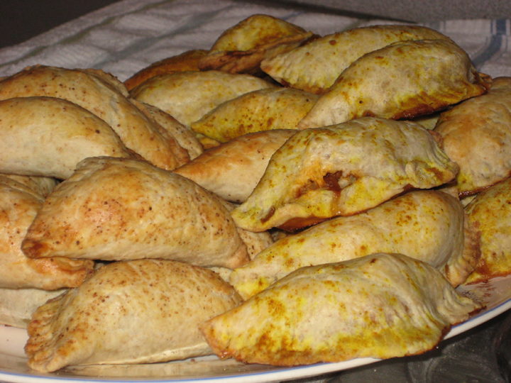 I took a leaf from south of the border and made empanada dough, and then borrowed from India and Italy when I choose the fillings. One variation is a play on a vegetarian calzone, and the other is riff on a samosa.