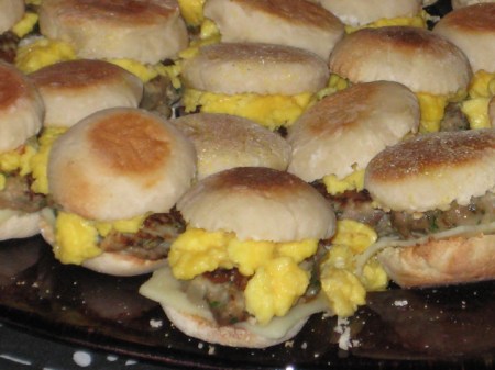 My roommate and I split the credit on this. She made the muffins since I don’t do yeast and she does, and I did the eggs and sausage. We didn’t really reinvent the wheel here, it’s pretty much the same thing you’d get if you went to Dunkin Donuts or McDonalds and ordered one for breakfast, except, you know, home made and fresh and bite sized, and I ate far too many of them.