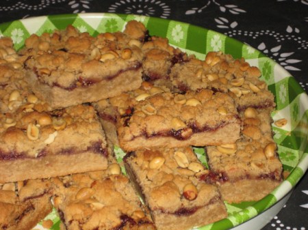 I don’t usually like peanut butter cookies or peanut butter & jelly bars because they never actually taste like peanut butter. And, if I’m going to eat something that purports to being peanut buttery I want to taste the peanut butter. These, tasted like peanut butter and left you craving a tall glass of milk to go with them. Most excellent.