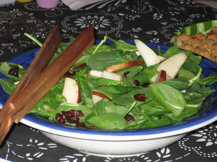 Okay, I admit it. I felt compelled to serve something in the green vegetable family to go with all the starch and butter on the table. But, I was stymied as to a junk food equivalent that I could class up because junk food isn’t really known for its vegetable cred. I eventually gave up and went with the classic baby spinach salad with some sliced pears, dried cherries and pumpkin seeds, tossed with a balsamic vinaigrette.