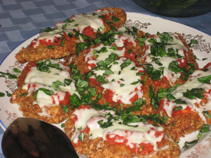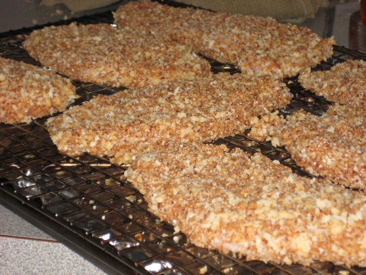 This is a variation on the baked chicken fingers I made for the Oscars this year, or put another way it’s the same technique for getting crispy chicken without going to the trouble of deep frying it.  Plus, it’s healthier for you (although the butter drenched garlic bread might be cancelling out the lack of deep frying – but since I would have served it with garlic bread even if I had deep fried it, we’re still coming out ahead in the healthy department).