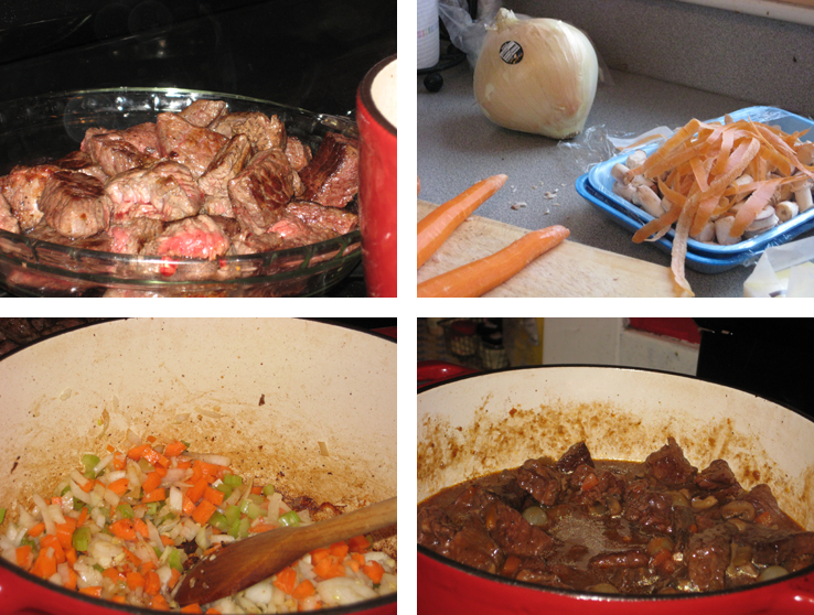 If you’re like me you add mushrooms and pearl onions with a heavy hand and skimp on the carrots. But, you could also leave the mushrooms out entirely and add in disks of carrots and cubes of potatoes (or sweet potatoes would be good too). You could use leeks instead of onions, or add parsnips if you like that sort of thing. You could even add green beans if you were the sort of person who didn’t loathe green beans in stews (unlike say, me). You could leave out the vegetables all together and add a lot more onions and you’d have Carbonnade. The recipe below is really just a base that you can manipulate anyway you like depending on your whimsy and the contents of your fridge.