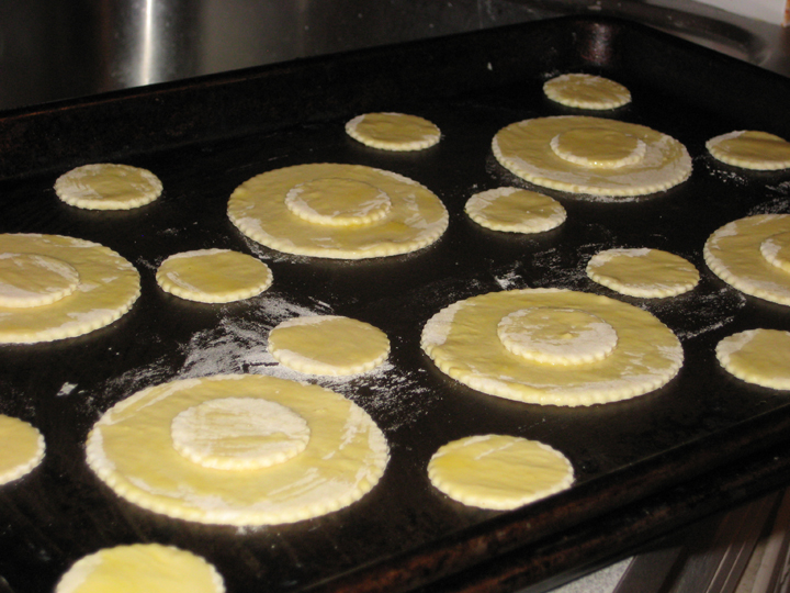 Roll out the second sheet of puff pastry as above and cut out an equal number of smaller rounds. Place each smaller round in the middle of a larger round (you’re making top hats, get it?) and brush with some of the egg wash.