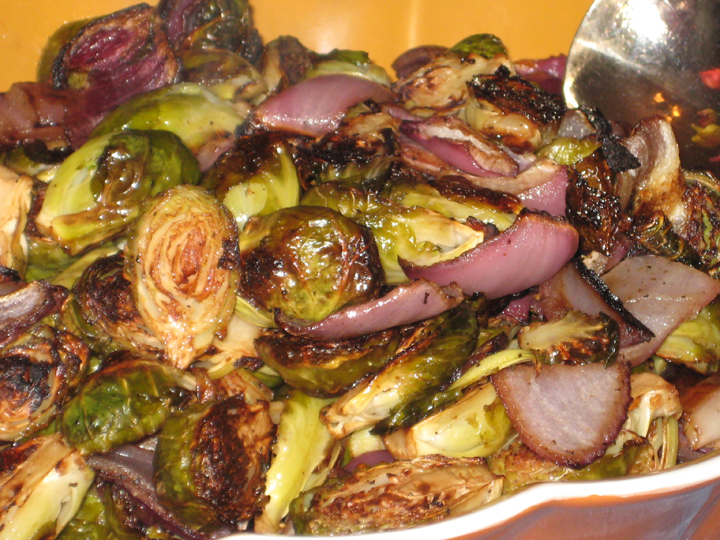 Toss the brussels spouts and onions with salt and pepper, drizzle with 1-2 Tbsp balsamic vinegar and 2-3 Tbsp olive oil. Toss to coat thoroughly. Arrange so that the cut side of the brussels sprouts are down.