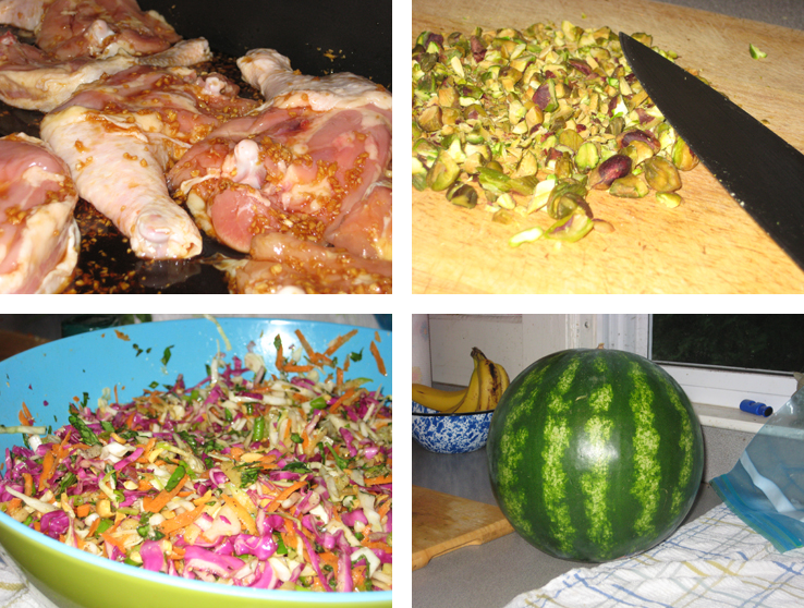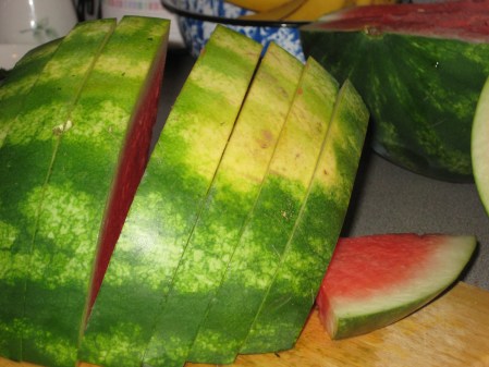I have had the epiphany that if I buy a whole watermelon I don’t have to try and find room for it in the fridge in between my trip to the grocery store on the weekend and Dinner. And, in the unlikely event that Dinner is unequal to the task of polishing off most, if not all, of a watermelon, I am perfectly happy to snack in it as the week progresses.