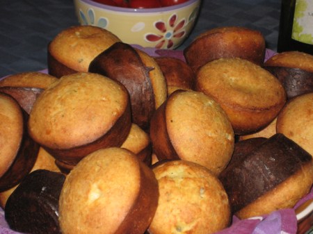 The verdict . . . . . well, they definitely didn’t pop. They came out like a very eggy muffin. Don’t get me wrong, they were tasty and we definitely ate all of them, but they weren’t popovers. I liked the subtle corn flavor and I want to make them again to see if I can get them to pop if I bake them using the split temperature method. There was, incidentally, no difference in the pan that got preheated and the pan that didn’t so next time I won’t bother preheating the pan.