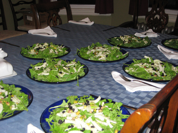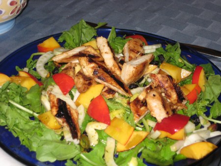 This go around it features baby arugula (for those who like such things), baby spinach (for those who don’t), fresh nectarines, fennel, dried blueberries and pistachios with a light orange-honey vinaigrette. Plus, you know, grilled chicken.