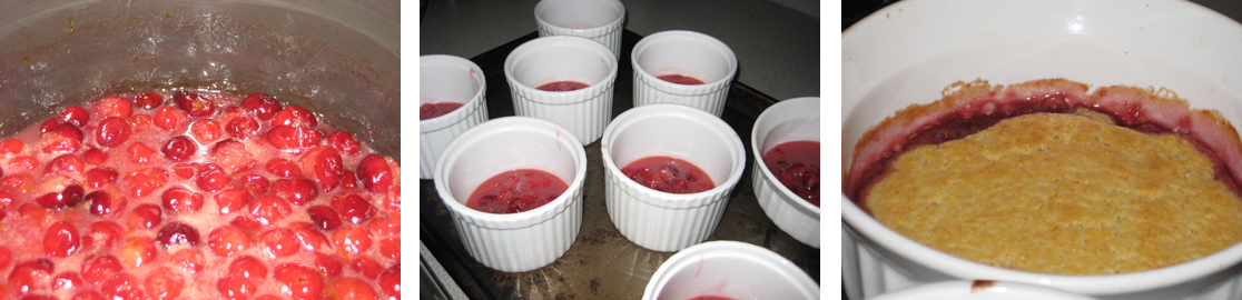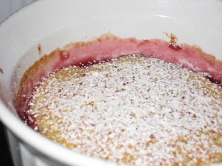 Bake until cake is golden and cranberry mixture bubbles at edges – about 28 minutes for an 8×8 pan (about 20 minutes for individual ramekins).  Cool 15 minutes (or 10 minutes for individual ramekins).  Serve warm with some crème fraiche or ice cream on the side, or simply dusted with powdered sugar.