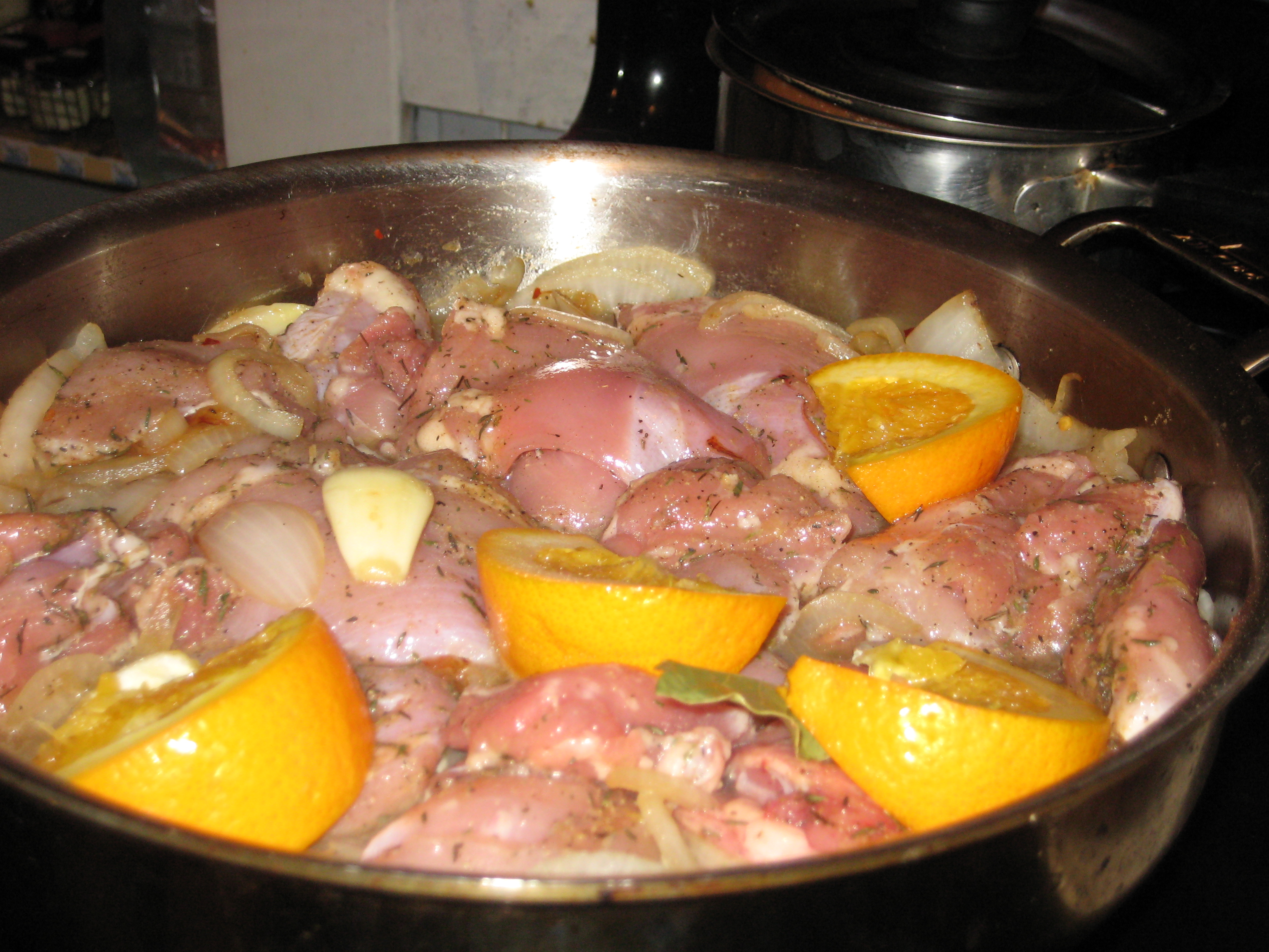 Meanwhile sauté the onion and garlic in some olive oil until the onion is softened and starting to turn golden. Add the red pepper flakes and stir to combine. Add the chicken to the pan and stir to coat. Add the chicken stock and orange segments (giving them a bit of a squeeze as you add them to the pan). Bring to a low simmer, cover and cook for 20-25 minutes until the chicken is done. Allow to cool slightly.