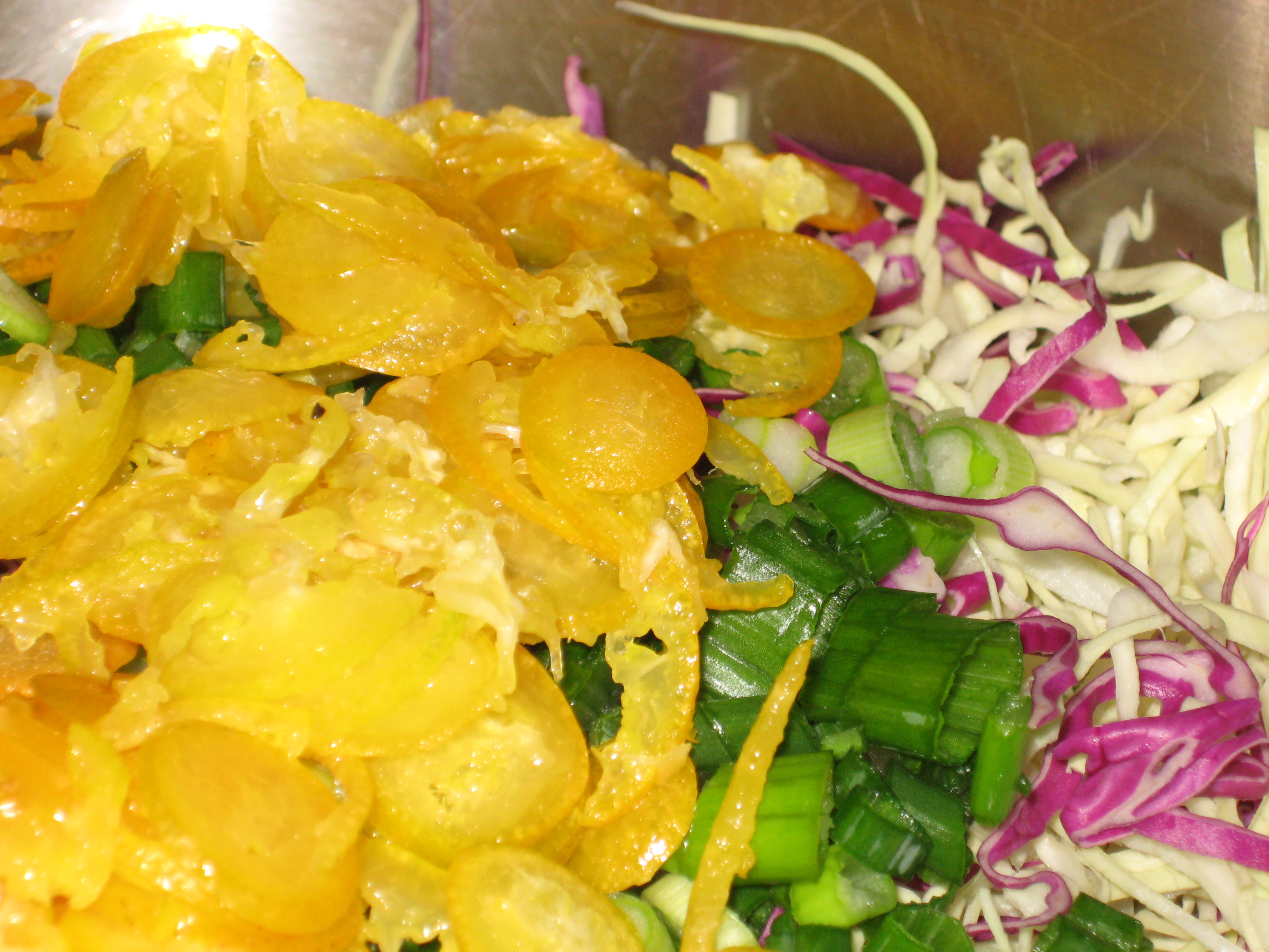 Toss the cabbages, grated apple, kumquats and scallions in a bowl. Season with salt and pepper. Toss with enough dressing to moisten, but not be goopy. Allow to sit for 20-30 minutes to marry the flavors.