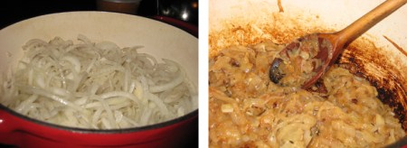 I won’t lie, this is time consuming. It has two saving graces. One, you can assemble it the night before and put it in the oven to bake when you get home the next night. And two, provided you do it in two pans you can get everything else for the recipe done and cleaned up while the onions are caramelizing (because they really do take the better part of an hour to achieve that melting caramelized state of nirvana and you shouldn’t try to rush that kind of bliss).