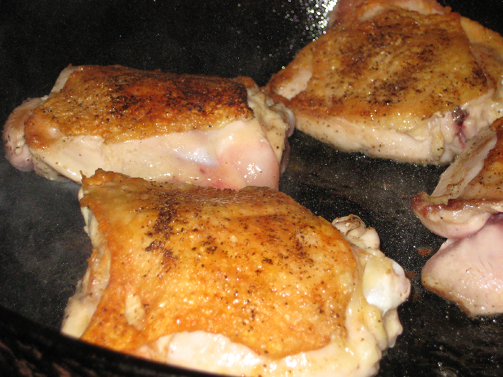 While the onions are cooking, heat a large heavy pan over medium-high heat. Trim any excess fat/skin from the chicken thighs, pat dry, and season lightly with salt and pepper. When the skillet is hot, add the thighs skin side down and brown for about 5-7 minutes, or until the skin has formed a golden brown crust. Turn the chicken over and brown for another 3 minutes or so, or until some color has developed. You will probably need to do this in two batches. Remove from pan and set chicken aside.