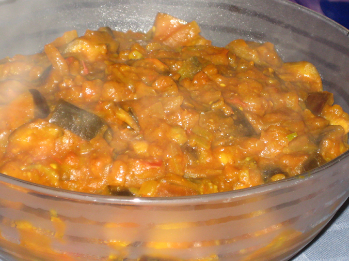 Add the water, pureed mango and eggplant and stir to combine. Cook at a simmer for about 15-20 minutes, stirring occasionally, until the eggplant is tender. Season to taste with salt, pepper, and honey.