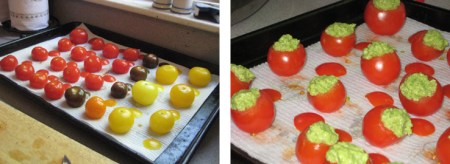 I recommend largish cherry tomatoes – not the smaller grape tomatoes – just so that you don’t drive yourself crazy trying to gut them.