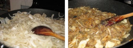 Melt the butter/olive oil in a large skillet. When it is hot add the thinly sliced onions and season with salt/pepper and a sprinkle of brown sugar. Saute over medium heat for 45-60 minutes, or until caramelized. Add the garlic and sauté until fragrant. Deglaze the pan with a little white wine (or chicken stock). Cook off all the liquid until you have a sticky mass of golden brown onions. Cool. (I recommend doing this the night before).