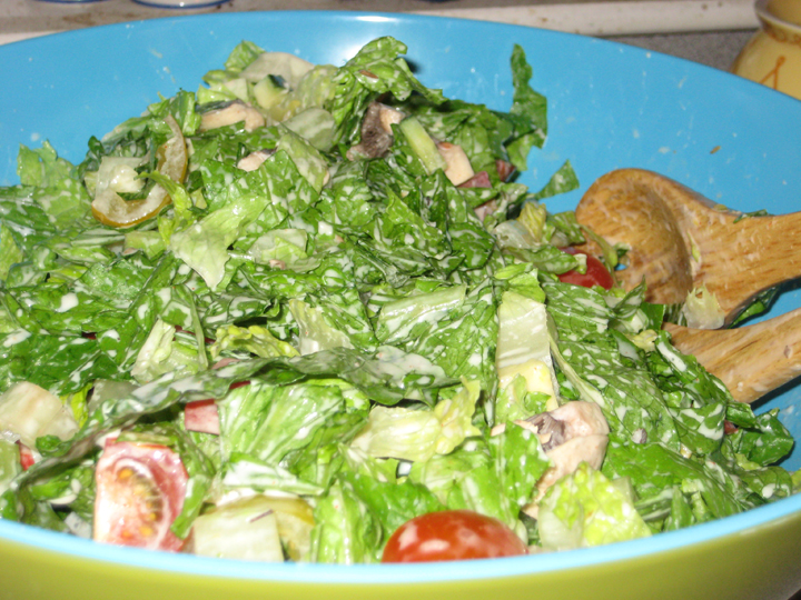 I figured if I was going the home made take out route I should follow through with the salad, so romaine lettuce, lots of assorted sliced veggies (cucumber, red pepper, zucchini, mushrooms, tomatoes) and ranch dressing.