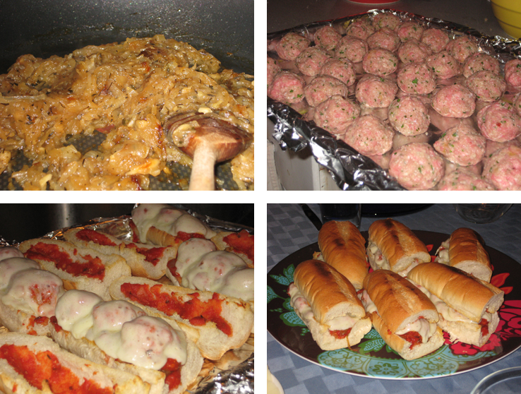 Spoon a thin layer of sauce onto the top and bottom of each roll. On the bottom of the roll place a layer of caramelized onions. Arrange the meatballs onto the bed of onions (I figure about 3-4 meatballs/person to start with – but this will be dependent on the size of your meatballs and the size of your roll), making sure to get a little of the sauce with each meatball. Top with cheese and return to the oven/broiler until cheese melts (5-6 minutes). Top with the other half of the roll and serve immediately.