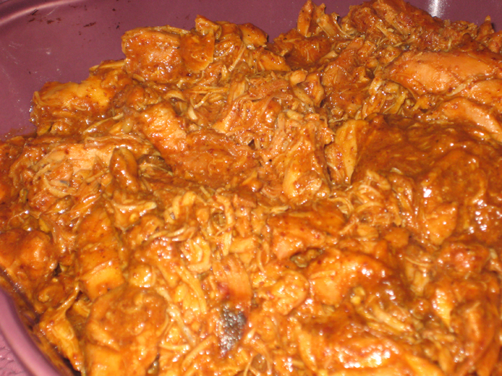 Combine all the ingredients except the chicken in a dutch oven (or other large pot) and bring to a boil. Add the chicken, reduce to a simmer, cover and cook for 25-30 minutes or until chicken is cooked through. Remove the chicken from the sauce and use two forks to shred the meat (I don’t shred too finely for this, I like to leave largish chunks of chicken, but that’s a personal preference). Return to the sauce and adjust seasonings to taste. If the sauce seems a little soupy you can boil it for 5-10 minutes to reduce and thicken before you return the shredded meat to the pan.