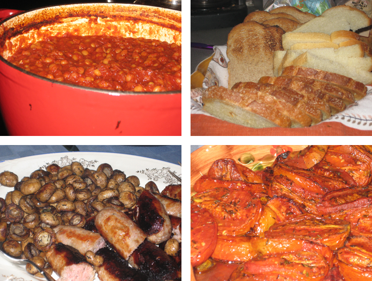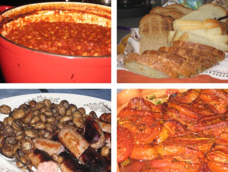 I observed the spirit of the fry-up, if not most of the actual frying, and split the difference between breakfast and tea and served baked beans on toast, bangers, roasted mushrooms, and roasted tomatoes. Also green beans, because well there had to be some kind of vegetable on the plate, and while mushy peas might have been the more traditional choice, I’m pretty sure nobody at my table was going to be impressed by that much authenticity.